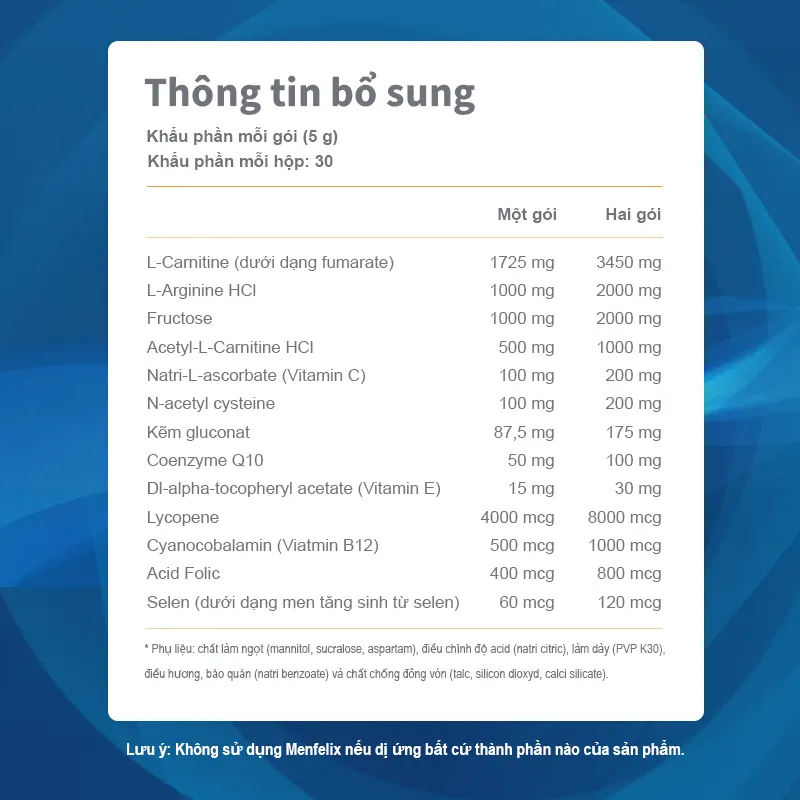 L-Carnitine (dưới dạng fumarate): 1.725mg – một axit amin có vai trò quan trọng trong việc chuyển hóa năng lượng, hỗ trợ cải thiện chất lượng tinh trùng.